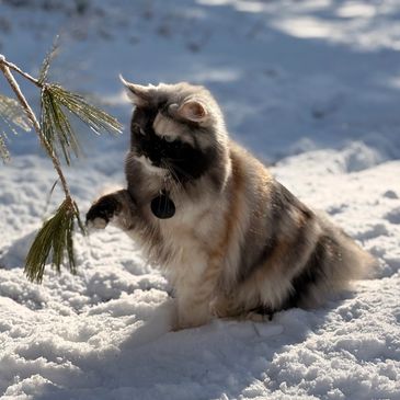 The most regal and sophisticated of our Queens. She loves to sit high on her perch while observing her surroundings. With her piercing beautiful ice blue eyes and and multi colored straight fluffy coat, she serves well as a Queen